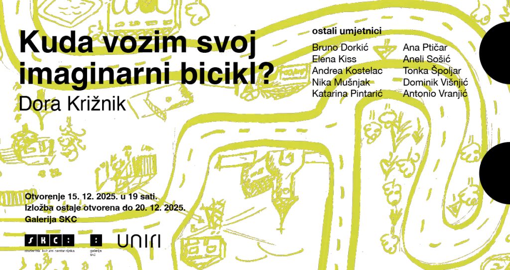 U ponedjeljak, 15. prosinca 2025. godine, u 19 sati u Galeriji SKC održat će se otvorenje izložbe Kuda vozim svoj imaginarni bicikl?. Na ovoj skupnoj multimedijalnoj izložbi svoje će radove predstaviti desetero autorica i autora, studentica i studenata Akademije primijenjenih umjetnosti u Rijeci i Filozofskog fakulteta u Zagrebu. Izložba je ujedno i oproštajna izložba naše drage voditeljice Galerije SKC Dore Križnik kojoj zahvaljujemo na posvećenosti i neizmjernom doprinosu.